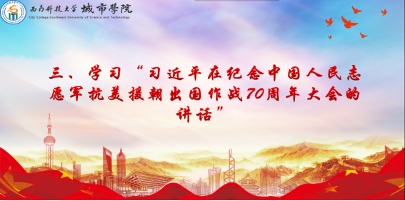 第三项议程:学习“习近平在纪念中国人民志愿军抗美援朝出国作战70周年大会的讲话”。党员同志们一同阅读了抗美援朝的发展历程,领略了英雄历史人物们的艰苦征战岁月。其中让我们感触、印象最深刻的是第二党支部的何影同志与我们分享的抗美援朝的历史征程,回望中国人民志愿军雄赳赳、气昂昂的跨过鸭绿江,他们肩负着人民的重任、民族的期望,高举保卫和平、反抗侵略的正义旗帜,历经两年零九个月艰苦卓绝的浴血奋战,赢得了抗美援朝战争的伟大胜利。