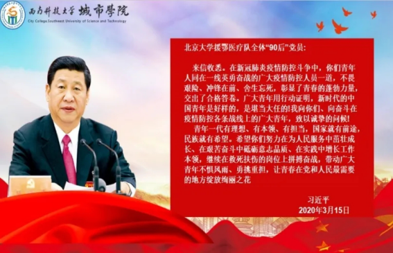 今年,我们的党和人民迎来了一次大考----抗击新冠肺炎疫情,在党中央的统一部署下,各方面物资紧急调运、抗疫医疗队集结、方舱医院建设……全国人民一起迎接这场大考。在抗议前线,青年一代的身影随处可见。以北京大学援鄂医疗队“90后”党员为代表的青年,为了表达战胜疫情的决心,在特殊时期,将自己的所感所悟向总书记和人民汇报。3月15日,习近平总书记做出了回信。