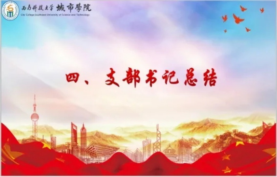 第四项议程张丽萍老师和钟迪老师对本次主题党日活动做总结,并提出了几点希望以及对毕业班党员同志的祝愿。我们要发扬党员的先锋模范作用,严格要求自己,也祝愿各位毕业班党员同志前程似锦,未来可期。